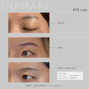 Before→After[INKMAKE#01_1回目] 投稿日 2026-04-05 著者 colien staff カテゴリー Recommend 顔タイプ:ソフトエレガントなので、少し細めで柔らかい曲線デザインにしてます。長さは2回目で出すご希望なので、1回目は少し短めに。 色はカラータイプ:オータムのため、ブラウンとカーキを混ぜたインクで仕上げました! メニュー名:似合うINKMAKE ※1週間後のお写真はお客さまに送って頂いてるため、色味やアングルが多少異なります。
